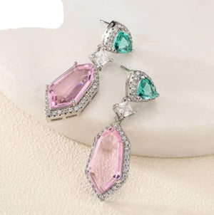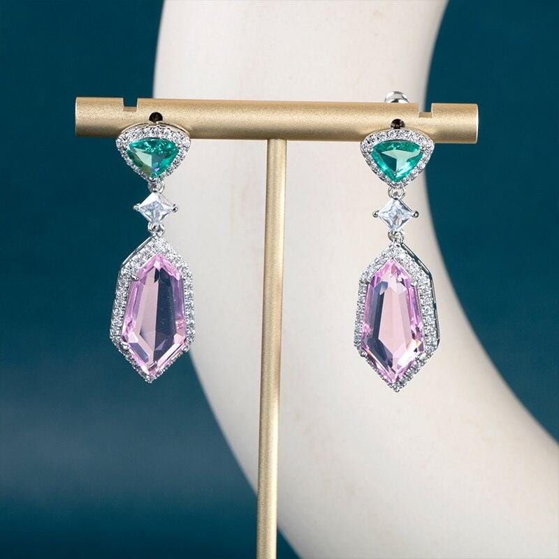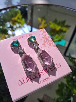 These elegant earrings combine a green teardrop stone with a pink geometric crystal, highlighted with delicate zircon accents. Their silver-plated base adds a soft, premium shine. Perfect for brides, events, and anyone who loves jewelry with a bold yet feminine vibe.