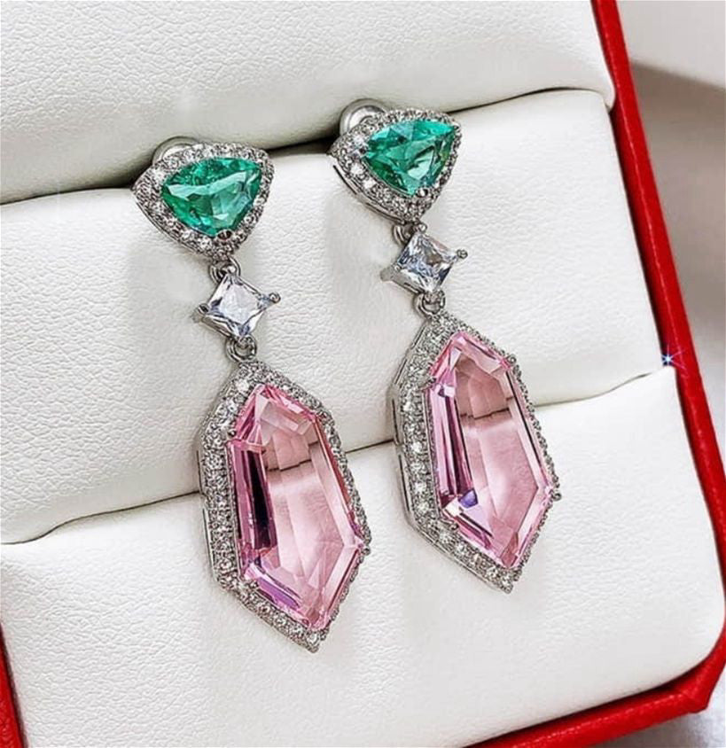 Elevate your evening look with these stunning pink sapphire and emerald cubic zirconia drop earrings, designed to dazzle at any cocktail party or gala affair. The vibrant pink sapphires and rich emeralds are beautifully enhanced by sparkling cubic zirconia rims, creating a captivating play of light and color. These earrings are the perfect accessory for adding a touch of elegance and glamour to your ensemble, ensuring you shine on any occasion.