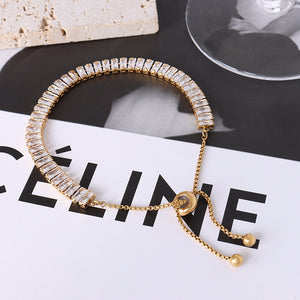 The Stary Shine Bracelet is a timeless classic, combining a gold plated stainless steel chain with emerald cut cubic zirconia stones and is adjustable for a perfect fit. Its elegant design will ensure you look stunning every time you wear it.